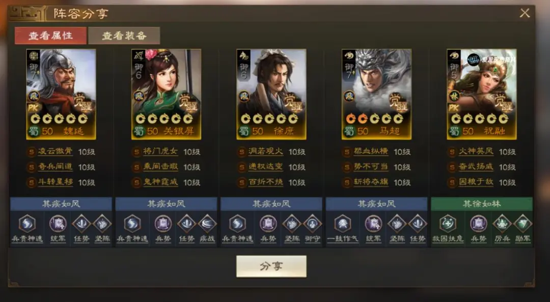 由于没法转阵营,这赛季的蜀骑大部分都是带的庞统,这队属于就算打输也能给对面打出战损,不容易白给的队伍。