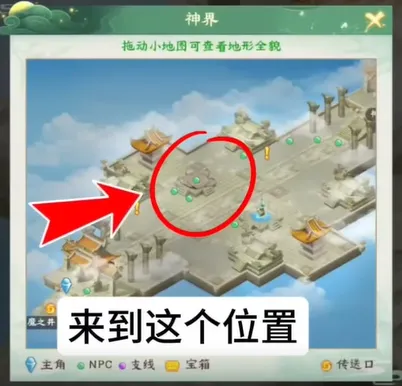 成功战胜由仙童装扮的沈砚清,再来到主线地图【神树-神界】,下图所示的位置,并与台上的仙童开启对话。