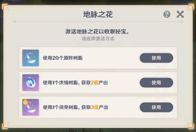 4、刷20体的地脉/秘境可以选择消耗须臾树脂,一次性获得3倍奖励(以后重复刷本就不用捏完树脂回去合成浓缩后再回来刷了)