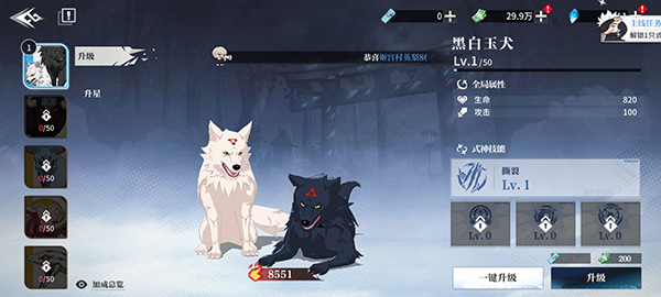 2、式神升级需要消耗咒术灵水,升级后可大幅提升伤害,并提升全局属性。