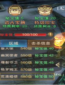 该BOSS玩法的进入副本后也是拥有100点秘宝值,也是该游戏魂器以及魂器材料产出的唯一途径,激活魂器能给与角色很大的属性加成,建议开启该玩法后,每天都把次数刷完! 除BOSS以外,还有远古宝箱和特级珍宝可供玩家采集,但采集宝箱也同样需要消耗秘宝值,详情可见下图。且该副本的BOSS挑战难度较高,击杀会比较耗时。(PS:按照物品掉落的稀有程度,优先级可以分为:副本BOSS≥特级珍宝>远古宝箱)