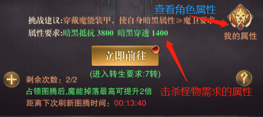要击杀副本中的怪物,需要满足副本怪物的属性要求,否则会被副本中的怪物“秒杀”。所以我们挑战副本需要根据副本页面右侧的“我的属性”一栏,查看角色的属性值,来挑选副本中合适的怪物进行击杀,待满足了下一层怪物的属性要求后,再进行前往挑战。层数越高的怪物,属性要求会越高