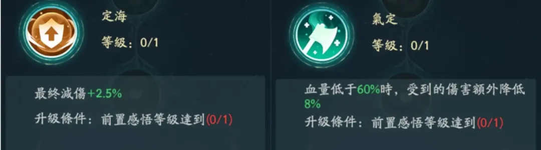 气定:血量低于60%时,受到的伤害额外降低8%!也是一个防护类的被动技能!