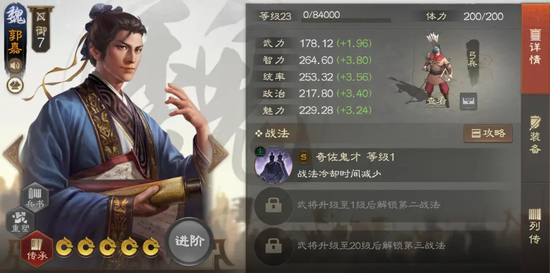 郭嘉带四世余晖+空室清野,兵书改三军用命,主打DOT流,SP曹操单点突破。在没有两个SP曹操的情况下,也可以让SP曹操带士别三日+四世余晖,然后郭嘉带遁甲天书+环环相扣,这样带的SP曹操叠被动算是比较快的,打不少队伍都表现不错,但如果对面有满红孙尚香就会比较僵硬,因为这样的SP曹操秒不掉孙尚香,容易被反击反死。