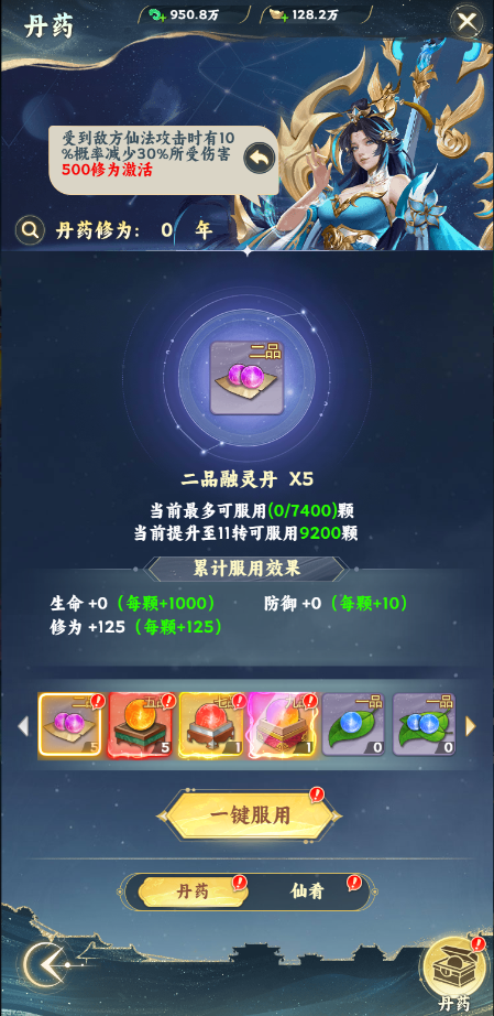 玩家一转开启丹药,玩家可通过食用丹药和美食提升玩家属性和对应的丹药修为和美食修为,当修为到达一定值还会获得特殊增益效果。