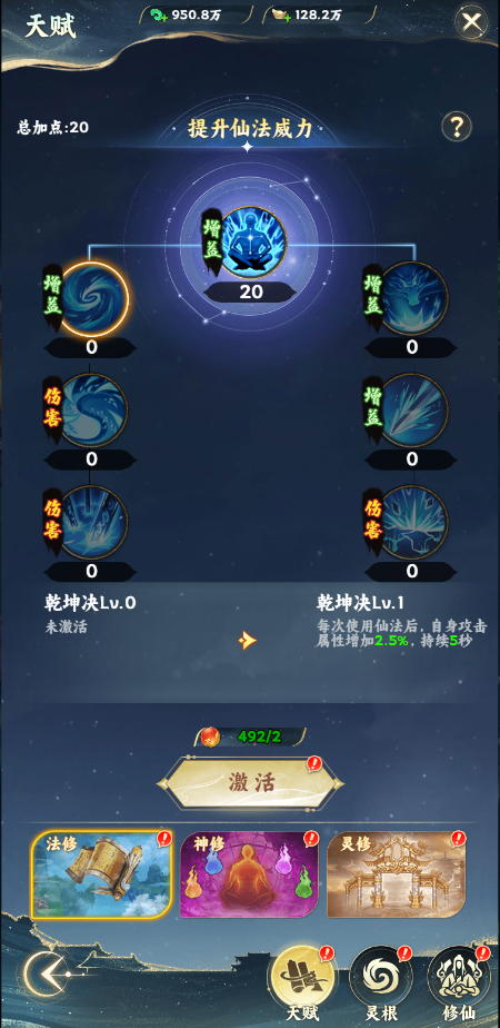 修仙五转开启天赋,玩家到达500级后会获得天赋点,消耗天赋点可以激活或升级天赋,提升战力。