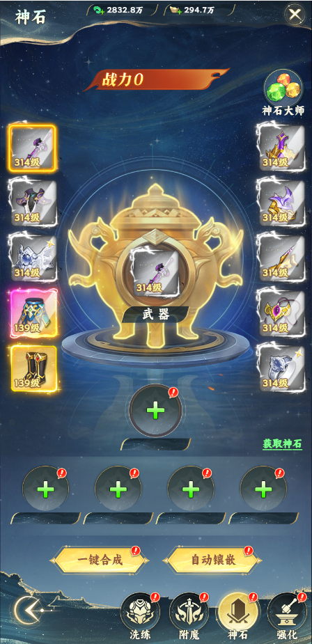 玩家可以通过镶嵌神石来给装备提供属性加成。三个同等级神石可以合成更高一级的神石。当玩家的神石等级合计达到一定数量时,就可以升级神石大师的等级,提升战力。