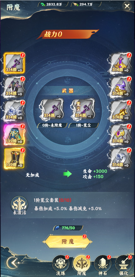 玩家使用一定数量的强化石可以强化装备,装备强化后会提升玩家属性。当全身装备强化到指定等级时,还会获得套装等阶的属性提升。