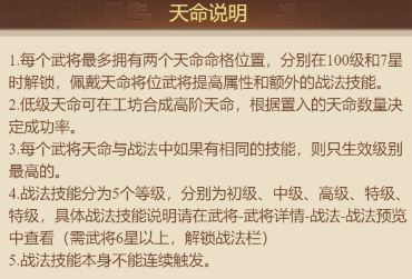 3.每个武将天命与战法中如果有相同的技能,则只生效级别最高的。4.战法技能分为5个等级,分别为初级、中级、高级、特级特级,具体战法技能说明请在武将-武将详情-战法-战法预览中查看(需武将6星以上,解锁战法栏)5.战法技能本身不能连续触发。