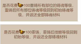 可通过消耗元宝重铸所有部位的铸魂等级,重铸后所有部位铸魂等级回到初始铸魂等级,并返还全部铸魂材料。