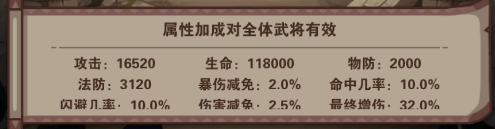 圣物:也是不需要等级就开放的,分别有橙色与红色品质的圣物,每个圣物的属性都不一样,有经验加成的(如洛神赋、太平要术)、有武将提示伤害(诸葛连弩)、有减伤的(昊天塔)等等;每个圣物也有不一样的被动属性,也有圣物共鸣加成;另外圣物属性也是对全体武将生效;