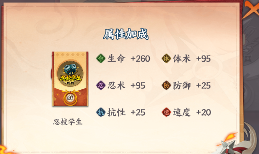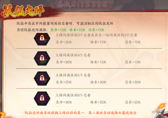 上阵3个同属性忍者:生命+15% 体术+10% 忍术+10%