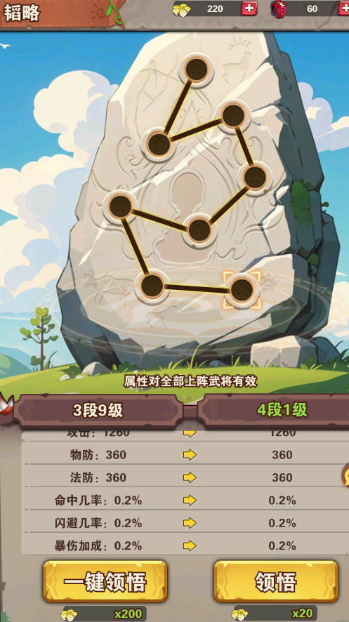 韬略系统比较简单,一句话来说就是通过家园系统里的烹饪,获得道具桂花糕,通过使用桂花糕在韬略中领悟,可以解锁大量属性加成