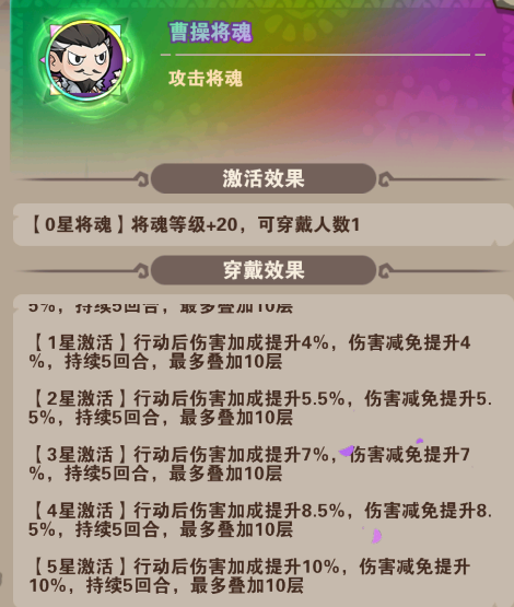 其中幻彩将魂种类多且技能十分强大,如曹操将魂增加伤害加成和伤害减免、刘备将魂增加爆伤加成和爆伤减免等等;当然红色将魂也是十分厉害的,主公可以根据自己的阵容和英雄进行不同的搭配哦