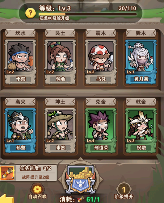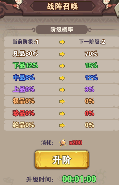 战阵为击鼓小玩法,通过击鼓获得战阵以提升属性;同时通过升阶鼓,可以获得更高阶的战阵,当然更高级的战阵带来的提升也是更大的