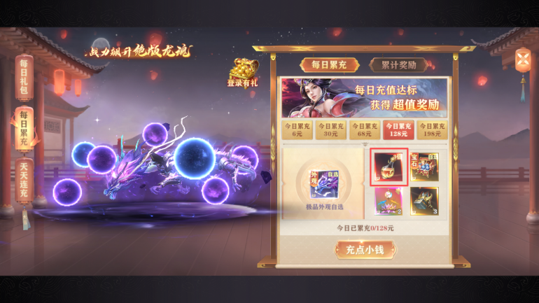 每日小充6元就可以获得1个2倍的经验药水,有钱的可以搞到128元的,再拿1个3倍的经验药水。