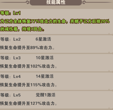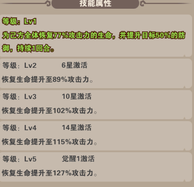技能:全体恢复生命并提升防御(恢复生命石根据自身攻击力结算的,所以攻击力叠高),