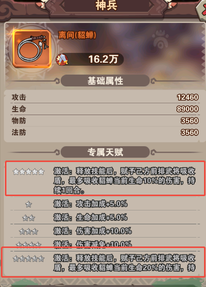 神兵:释放技能后为前排武将赋予护盾