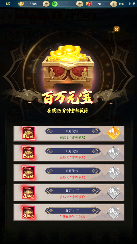 进入游戏后完成在线时长即可领取百万元宝,无门槛开启的