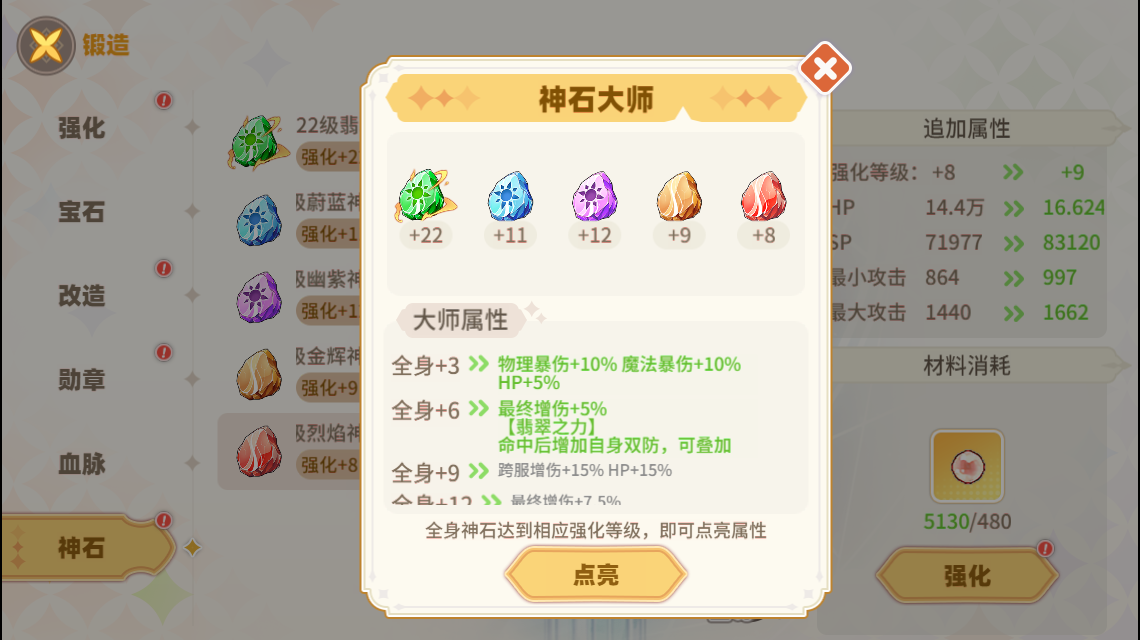 5种神石达到一定等级后可激活套装属性,玩家可点击全身按钮查看神石大师属性。