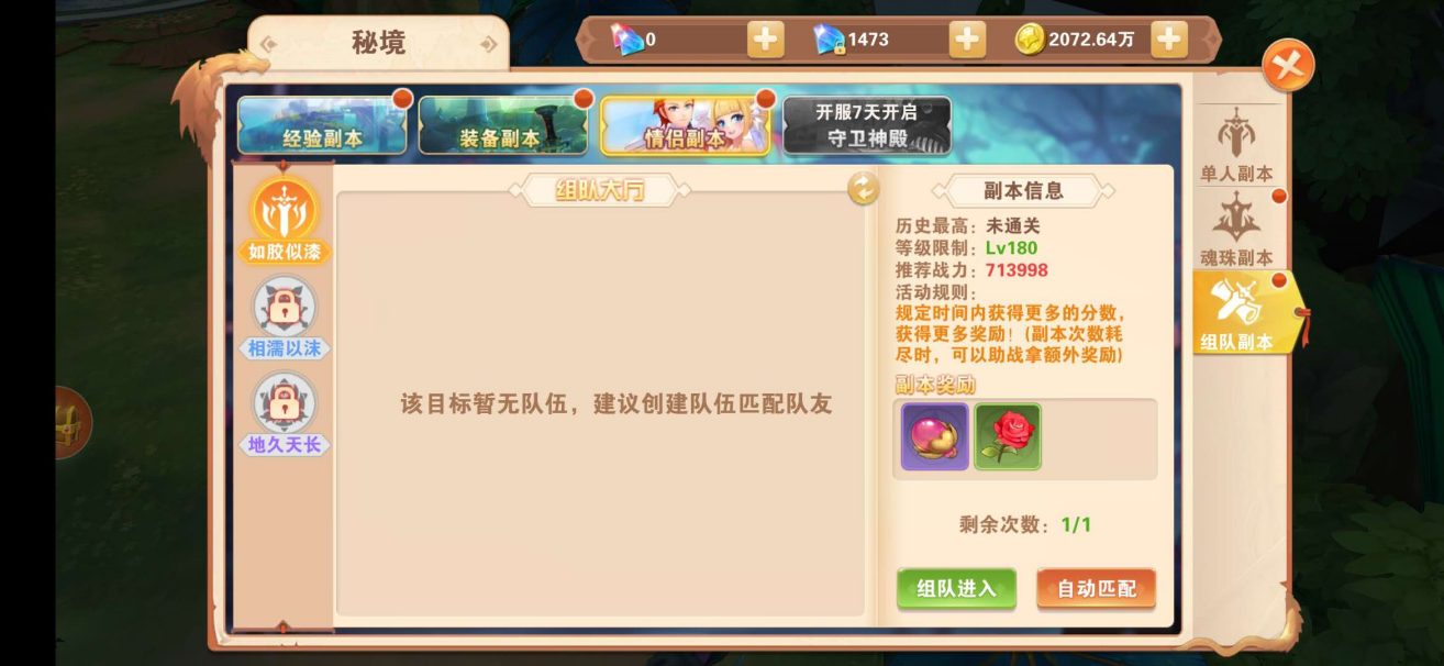 情侣副本一共有三个等级:如漆似胶-相濡以沫-地久天长,想要和CP互动增进感情,一定要来这里!如果你是一只单身汪……啊不!高贵的单身贵族,也要来这里!情侣副本不仅支持情侣组队形式,还支持系统自动匹配,遇到合适的TA就在一起吧!策划大大为了帮你们脱单还真是用心良苦呢~通过情侣副本可以获取鲜花和戒指升级材料。鲜花赠送给心宜的TA,感情加倍甜蜜哦!戒指是结婚必备,努力升级戒指,可以和CP步入婚姻殿堂哦~